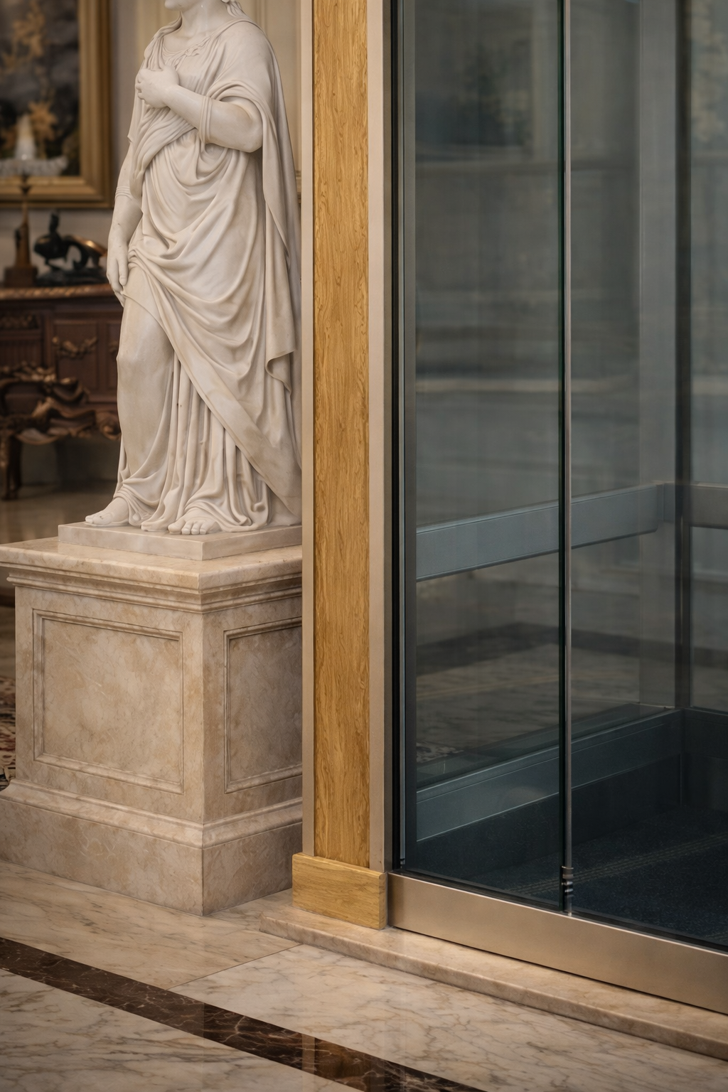 Il vano ascensore assume un ruolo architettonico centrale, valorizzando lo spazio attraverso la trasparenza delle superfici vetrate e la pulizia formale della struttura. Le finiture in tonalità calde e naturali dialogano con gli elementi classici dell’ambiente, creando un equilibrio tra linguaggio contemporaneo e architettura tradizionale.