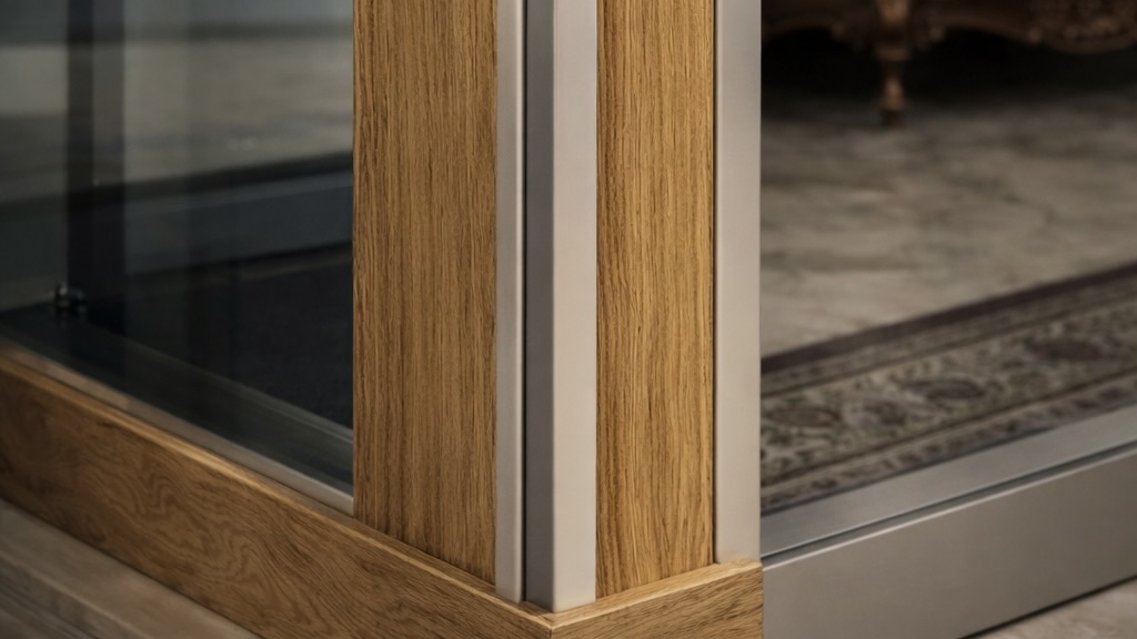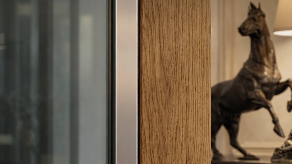 L’utilizzo di materiali naturali di rivestimento, come il legno, introduce una componente materica capace di conferire prestigio, calore e profondità percettiva alla struttura. Il dialogo tra vetro e legno rafforza il carattere architettonico dell’intervento, creando un equilibrio tra tecnologia e materia.